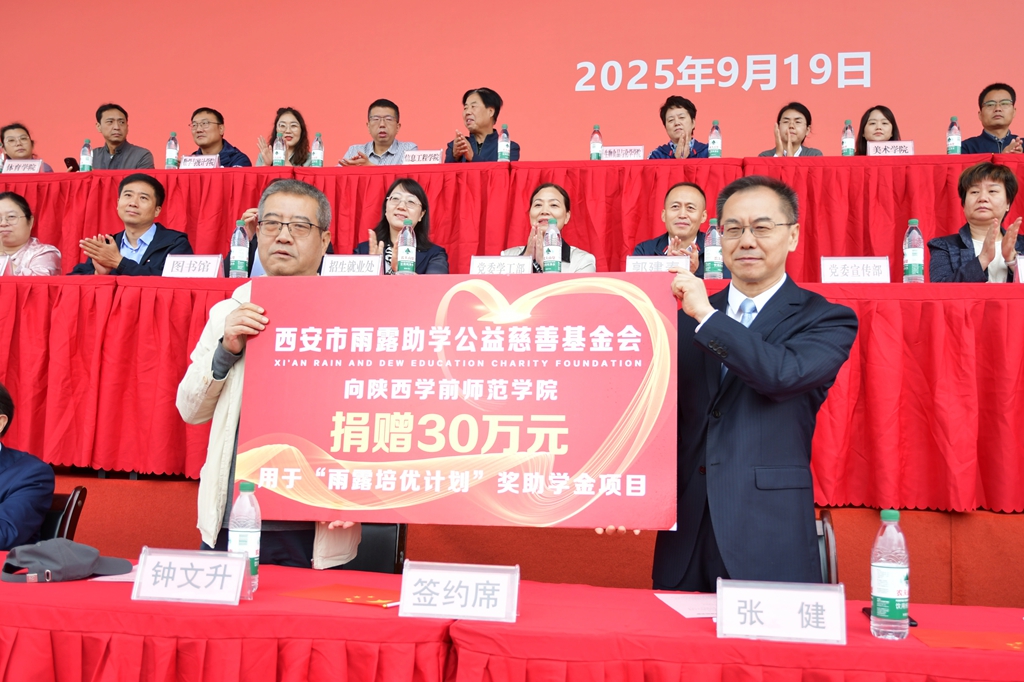 西安市雨露助学公益慈善基金会理事长钟文升、理事郭建春专程莅临。钟文升代表基金会向学校捐赠30万元雨露助学基金,张健与其签署捐赠协议。这笔善款将为家庭困难学子保驾护航,彰显了社会各界对学校教育事业的深切关怀。