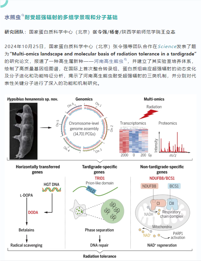 “中国蛋白质组学十大进展”评选是我国该领域首次系统性发布的顶尖成果,覆盖了发展战略、技术创新、科学研究与应用转化等多个方向。王立志教授团队与国家蛋白质科学中心(北京)张令强研究员、杨冬研究员团队合作完成的这项研究,属于“科学研究类”入选项目。该研究聚焦于具有惊人环境耐受力的水熊虫(缓步动物),利用多组学技术,系统揭示了其抵抗致死剂量辐射的全局性分子图谱和独特机制,为理解生命极限、开发新型辐射防护策略提供了重要的理论依据。